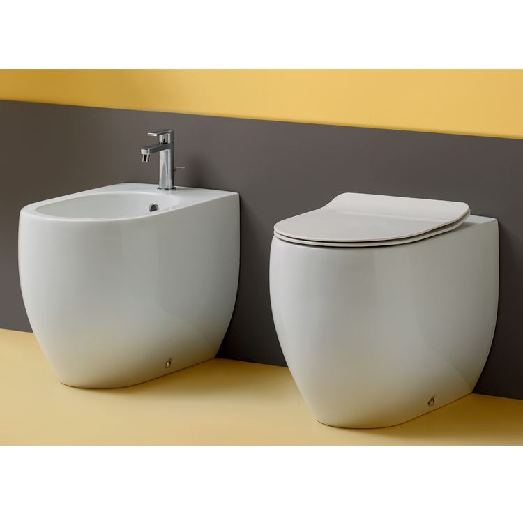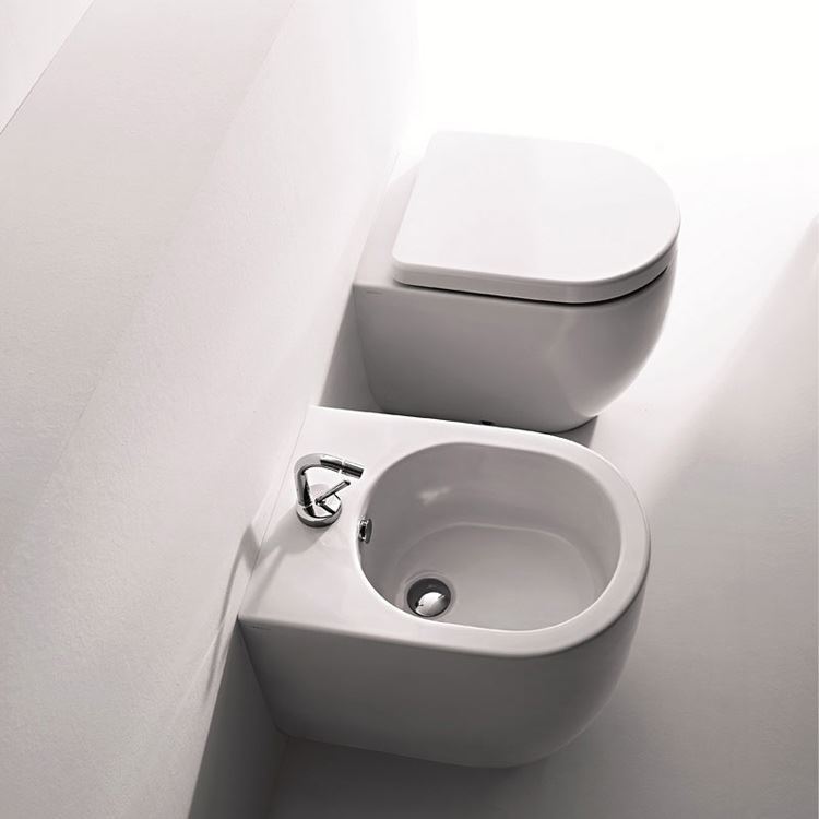 Kerasan Flo. Barely rounded, simple and timeless forms, characterized by the perfect oval that defines the basin of the washbasins and the profiles of the toilet bowl and bidet.
