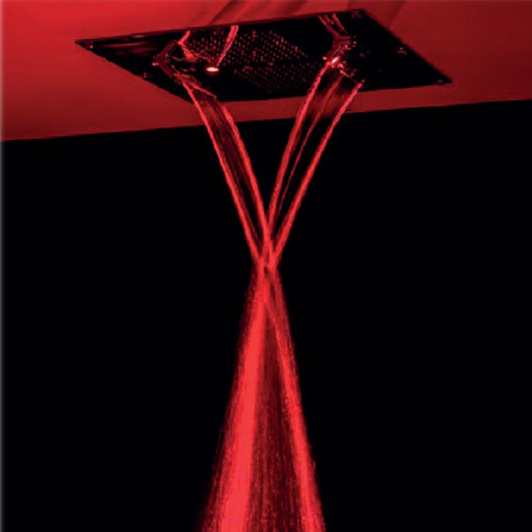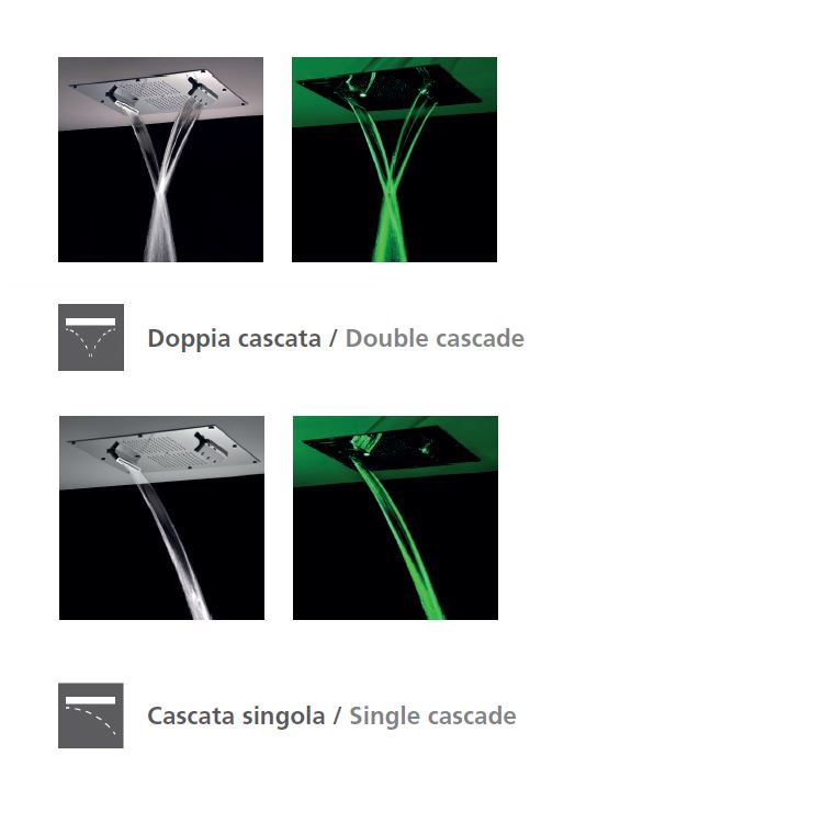 Multifunction built-in shower head, 55x50 cm, in chromed brass stainless steel, 242 nozzles in non-liming silicon, inspectionable and serviceable with 4 jets: rain, atomizer and double cascade with adjustable jet. (It is possible to open the cascades individually and/or simultaneously).