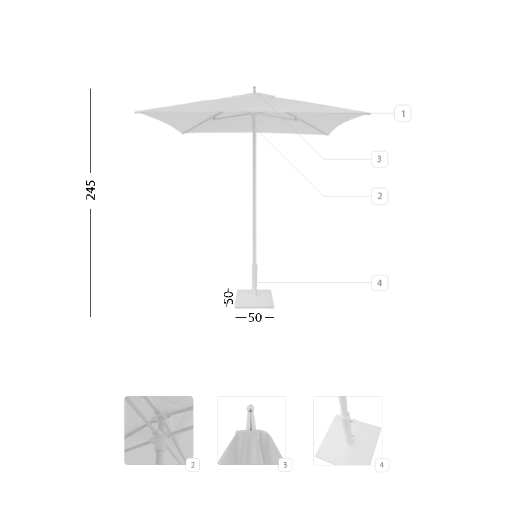 Easily parasol opening device; push upwards the parasol roof until the device locks. Canopy 2x2 in 2509 polyester with PU coating. Chrome-plated alu tip and Steel white base 40 Kg.